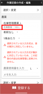 アプリでは作業記録時に使用する資材類の在庫の表示に対応しています。