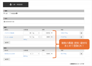 在庫を管理したい農薬・肥料・資材を、入庫ごとにまとめて登録できます。
