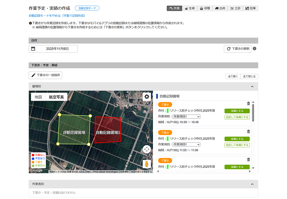 日付と圃場を選択すると、自動記録で取得した記録の下書きがある場合は、マップ右側に下書き記録が表示されます。