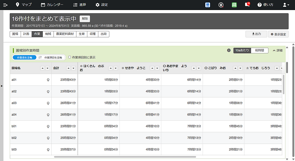 [作業]タブの圃場別作業時間の一覧表示では、作業に時間を要した圃場を特定したり、作業項目に応じた作業者別の時間集計を見るなど、いろいろな角度から記録を確認できます。