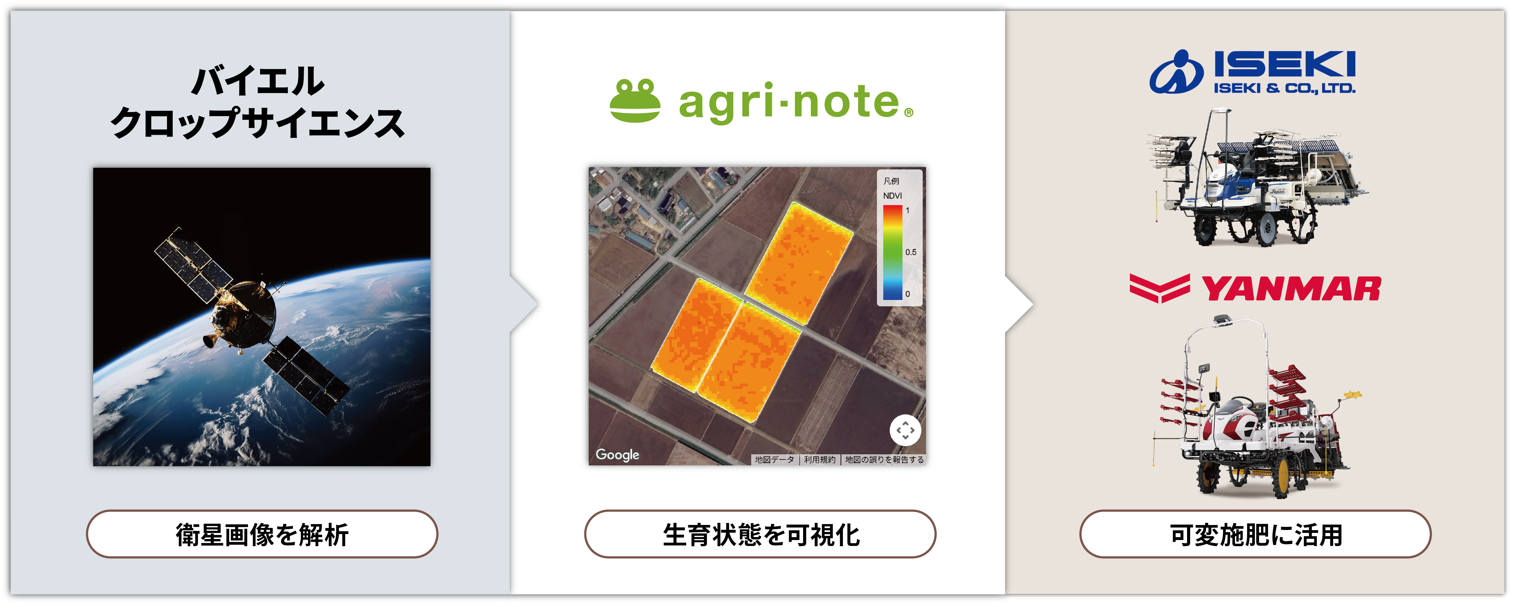バイエル クロップサイエンス株式会社(東京都千代田区、代表取締役社長:大島 美紀、以下バイエル クロップサイエンス)と、ウォーターセル株式会社(新潟県新潟市、代表取締役社長:渡辺 拓也、以下ウォーターセル)、井関農機株式会社(愛媛県松山市、代表取締役社長:冨安 司郎、以下井関農機)、ヤンマーアグリ株式会社(岡山県岡山市、代表取締役社長:所司 ケマル、以下ヤンマーアグリ)は、4社の技術と知見を活用し、衛星データを基に圃場の生育状況を可視化し、適期作業の実現から可変施肥による肥料の効率的な使用までを支援する機能を共同開発しました。本成果を活用し、ウォーターセルは「アグリノート 衛星リモートセンシングサービス」のお試し版を2026年3 月5 日より提供開始します。