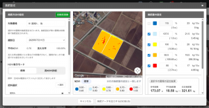 上図のマップ表示:左上の[画像の情報]欄から[施肥マップを作成する]を選択すると、施肥設計を行う画面に進みます。